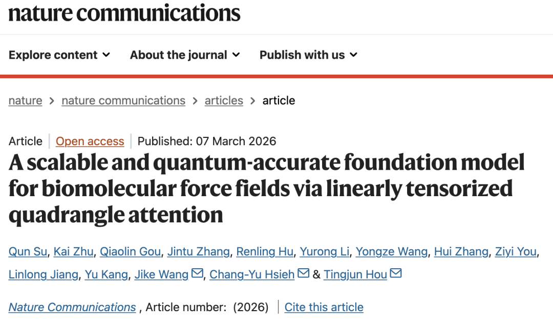 Su, Q., Zhu, K., Gou, Q. et al. A scalable and quantum-accurate foundation model for biomolecular force fields via linearly tensorized quadrangle attention. Nat Commun (2026).