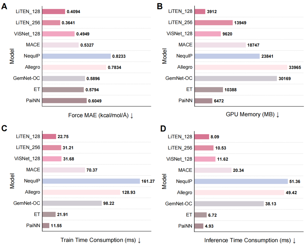 研究团队在 rMD17、MD22 和 Chignolin 等标准基准测试集上系统评估了 LiTEN 的性能。结果显示,LiTEN 在绝大多数子集上达到了最先进(SOTA)水平,在能量和力的预测精度及训练推理速度上,全面超越了 MACE、NequIP 和 Allegro 等主流高精度方法(图2)。