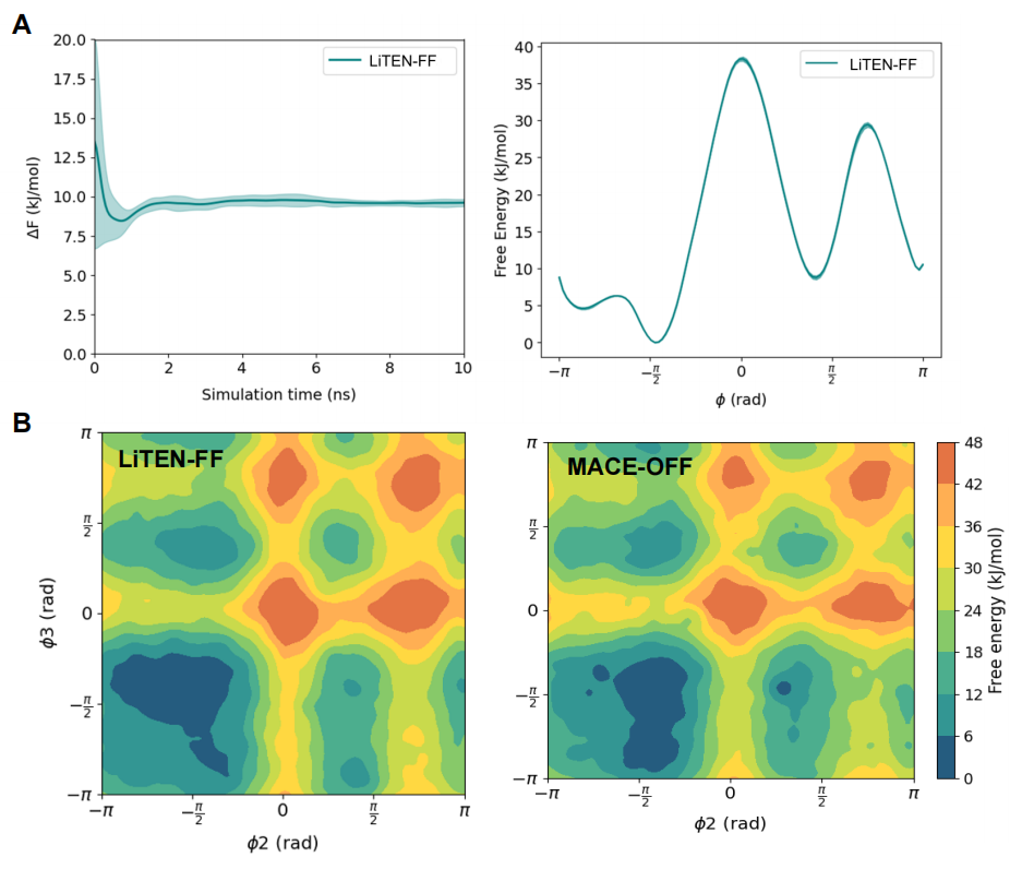 在更具挑战性的丙氨酸四肽(ala4)水溶液体系中,LiTEN-FF能够精准刻画分子的热力学动态行为。其生成的自由能表面(FES)景观与MACE-OFF高度一致,成功识别出四个关键的亚稳态构象盆地(图5)。此外,LiTEN-FF在捕获复杂构象异质性的同时,在大规模采样上展现出显著的效率优势,为真实溶剂环境下的生物大分子动力学模拟奠定了坚实基础。