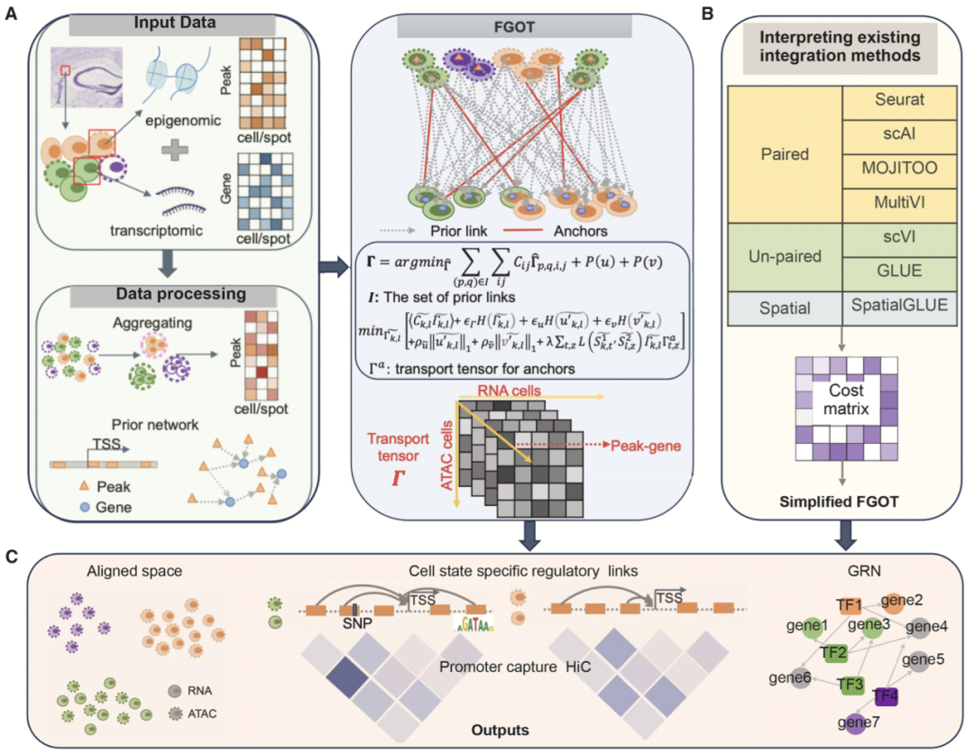为了解决这些问题,近日武汉大学人工智能学院张丽华教授和加州大学尔湾分校聂青教授团队在Cell Press细胞出版社期刊Cell Systems上发表了题为“Interpretable data integration for single-cell and spatial multi-omics”的文章,开发了一种基于特征引导最优传输(Feature-guided optimal transport, FGOT)的计算方法。FGOT创新性地将数据整合和细胞特异性转录调控网络推断相结合,能够同时揭示细胞异质性及其相关的转录调控关系。该方法的代码已经公开(https://github.com/lhzhanglabtools/FGOT)。