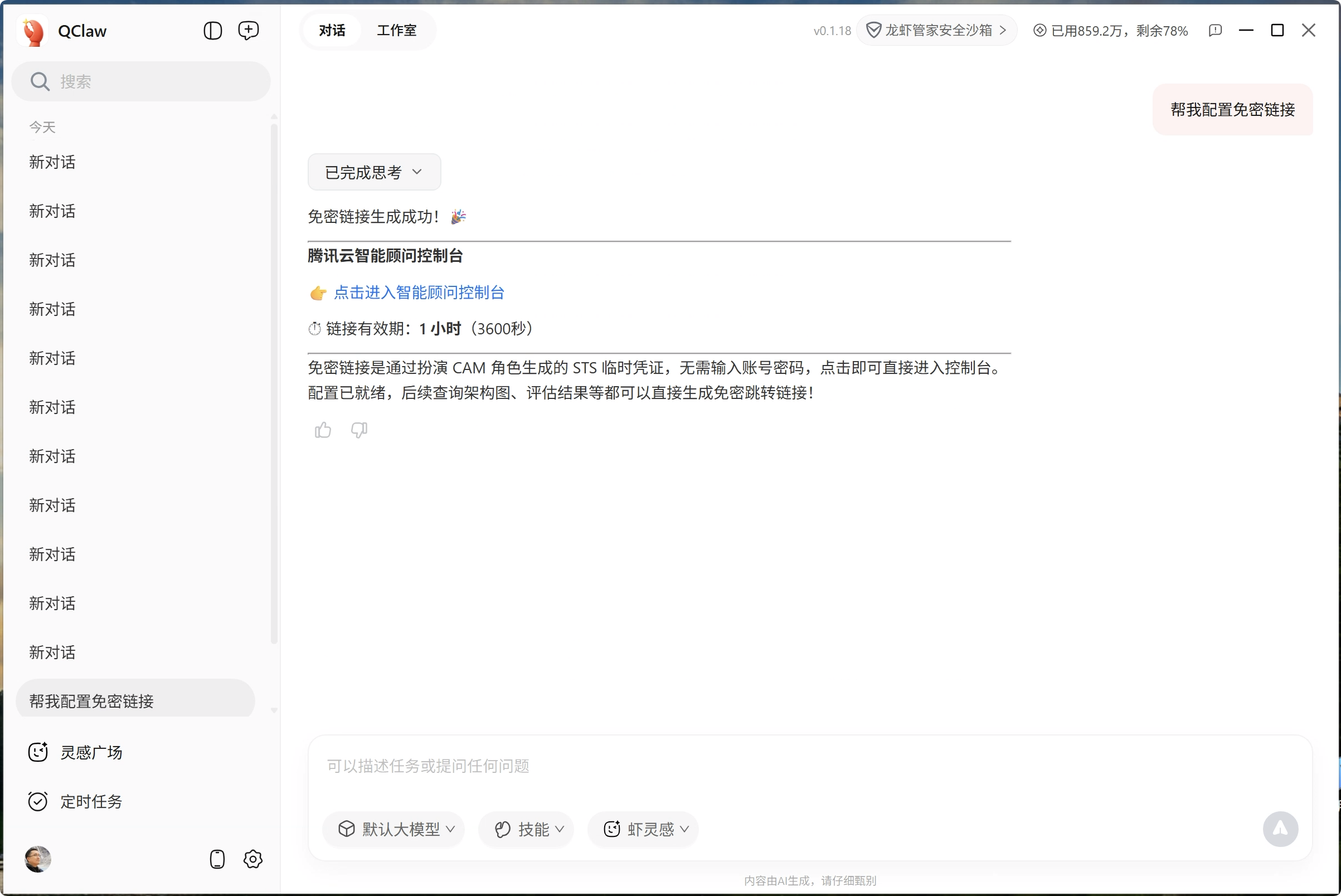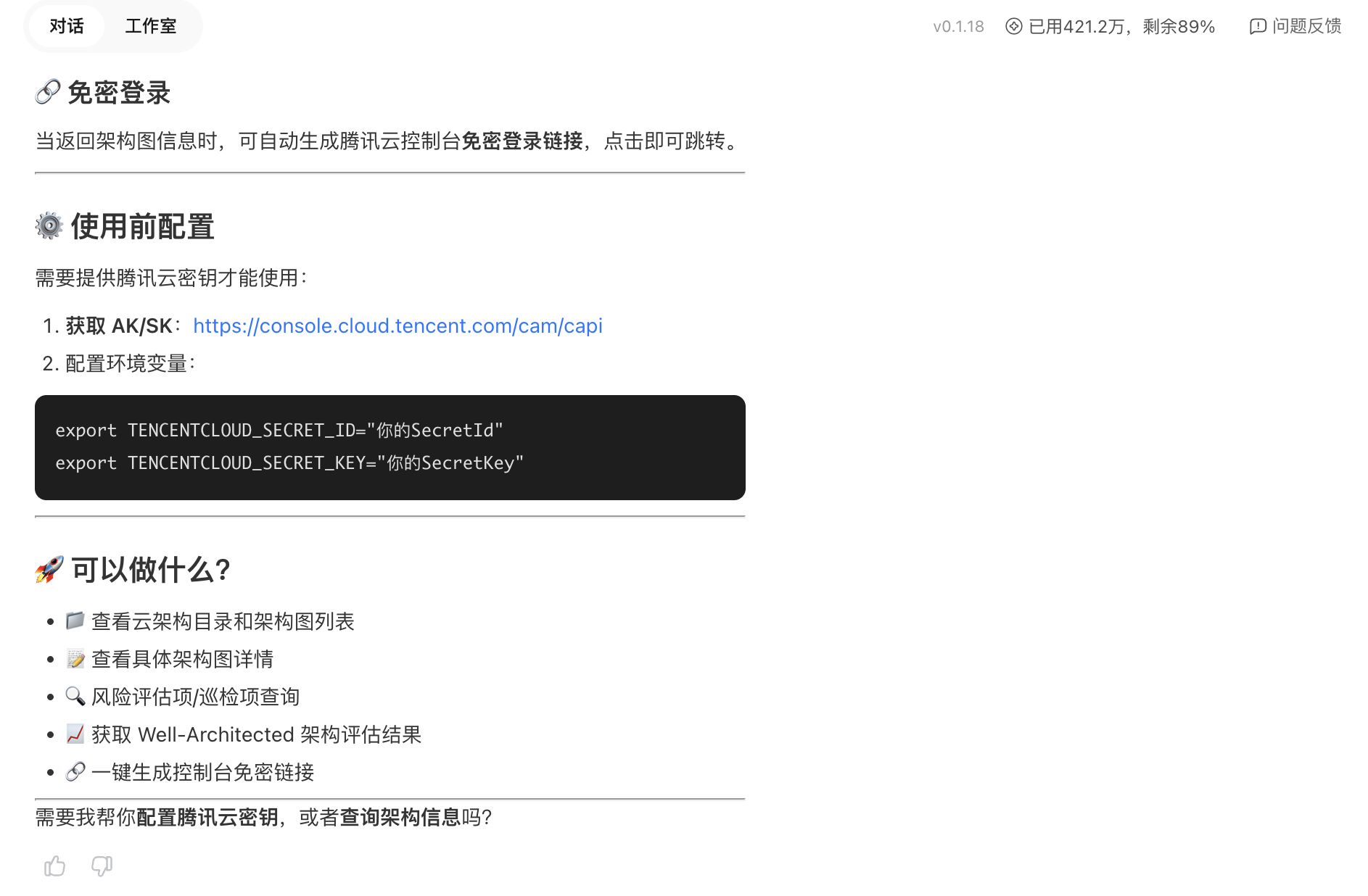 🔑 配置后,CloudQ 在对话中返回的控制台链接将支持一键免登录访问,无需再手动登录腾讯云。 |