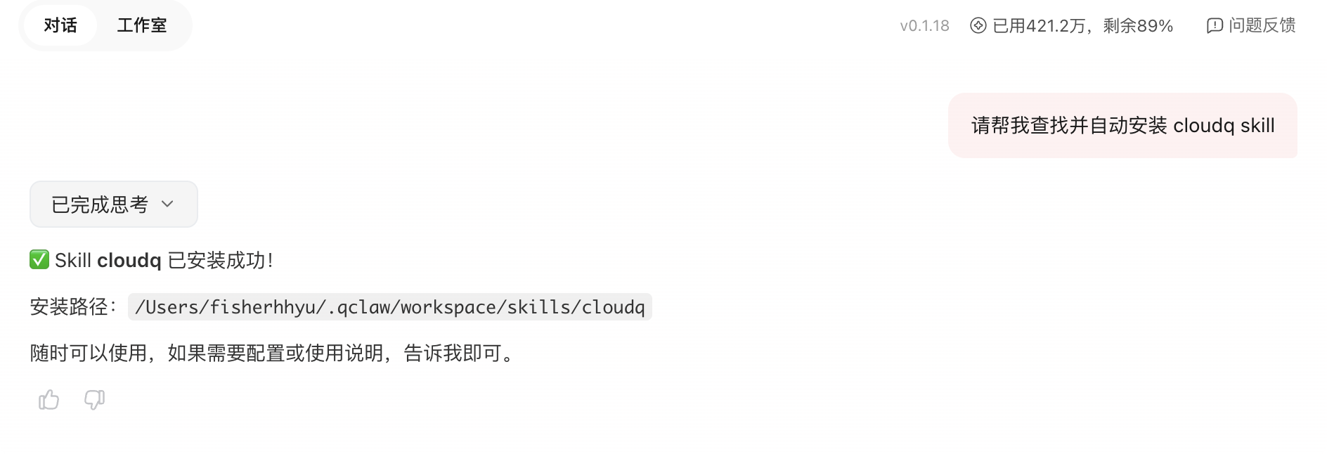 请帮我查找并自动安装 cloudq skillQClaw会自动查找Skill并完成安装