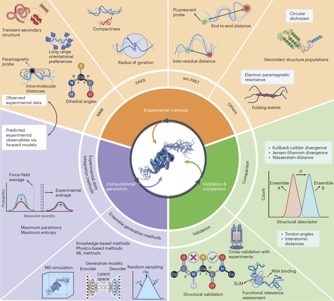 该统一框架围绕三个核心步骤展开:首先获取能够反映构象分布的实验数据,其次利用计算方法生成符合实验约束的构象系综,最后通过独立数据和统计方法对结果进行验证与比较。该框架强调实验与计算的循环迭代过程,即实验数据指导模型生成,而模型又用于解释实验结果,从而逐步逼近真实的构象分布。