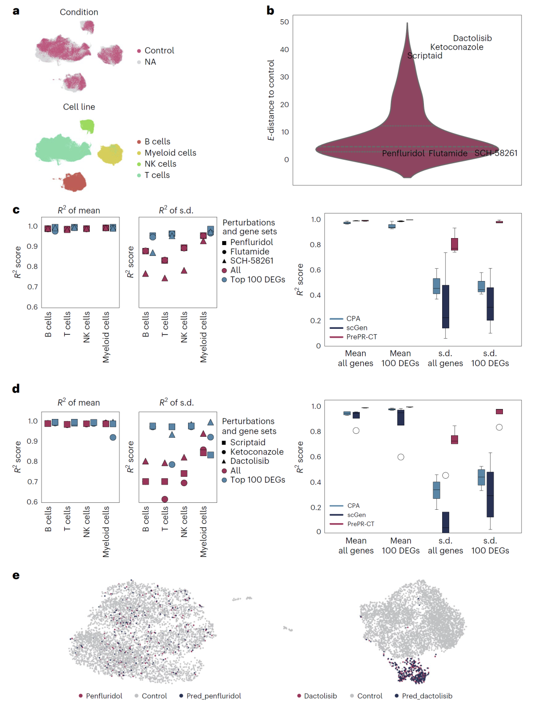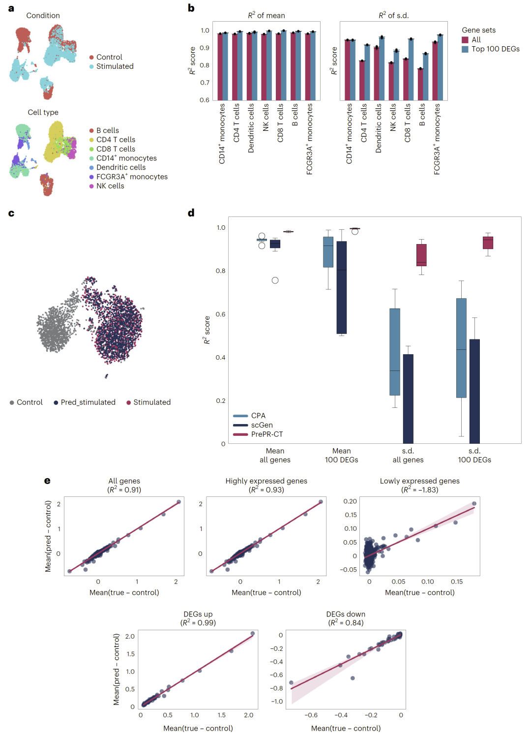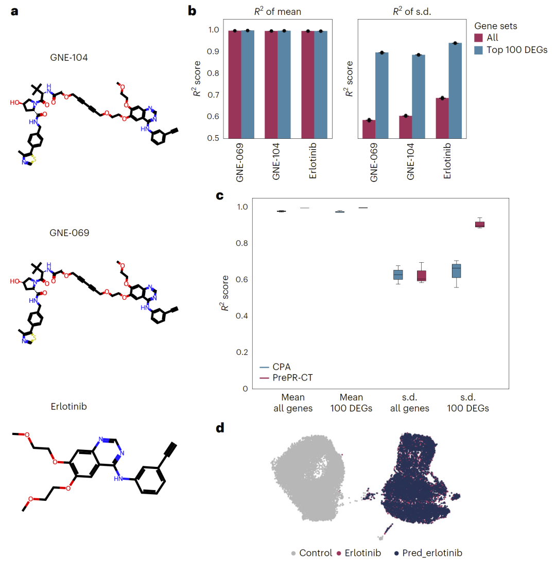 图2:PrePR-CT在未见过的细胞类型中准确预测单一扰动的影响。