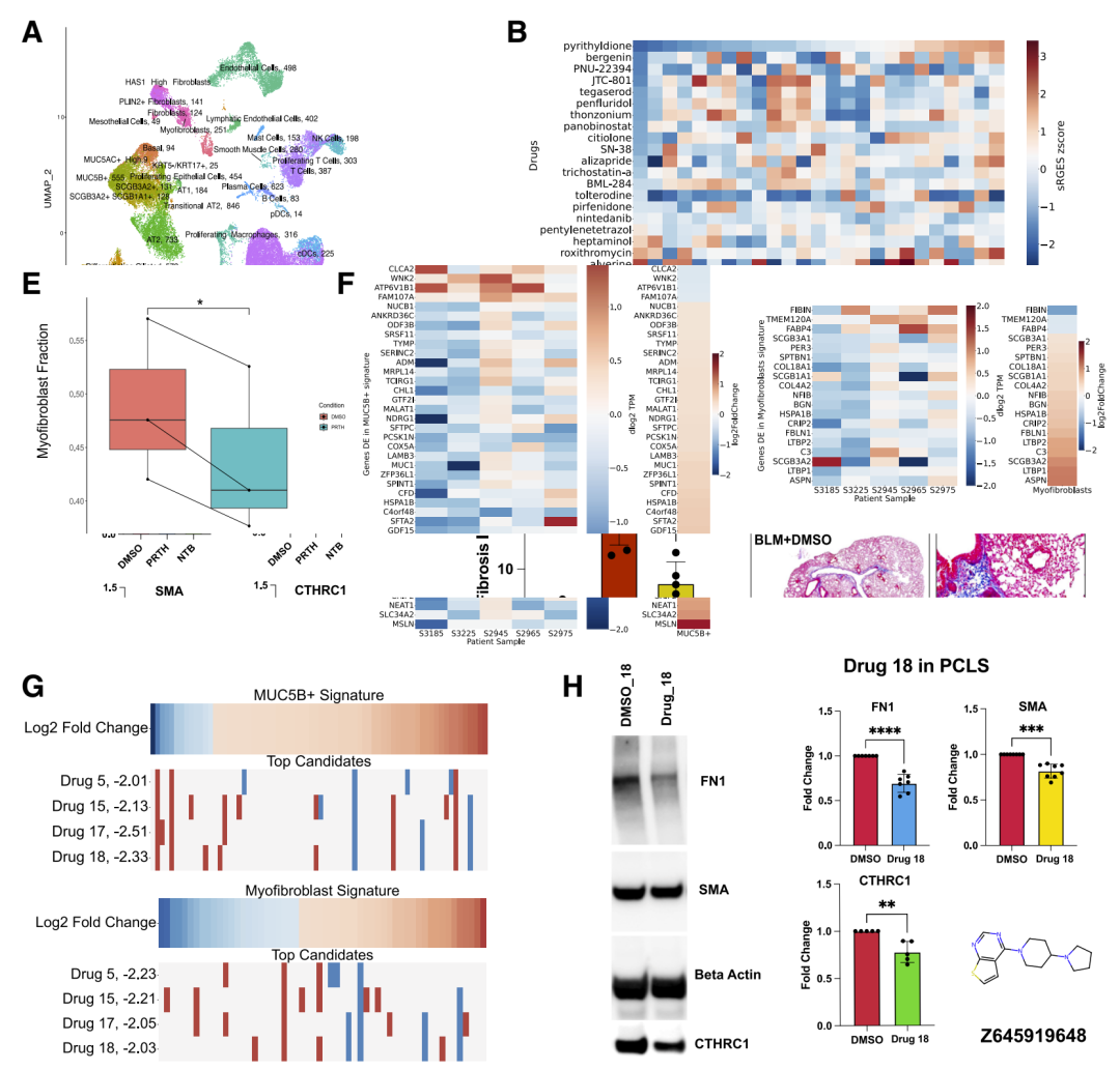 图6: 基于细胞类型特异性表达特征反转的IPF药物发现。