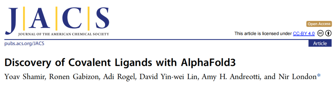 原文信息 Shamir Y, Gabizon R, Rogel A, Lin DY, Andreotti AH, London N. Discovery of Covalent Ligands with AlphaFold3. Journal of the American Chemical Society, 2026. DOI: 10.1021/jacs.5c22222 通讯作者:Nir London,魏茨曼科学研究所化学与结构生物学系
