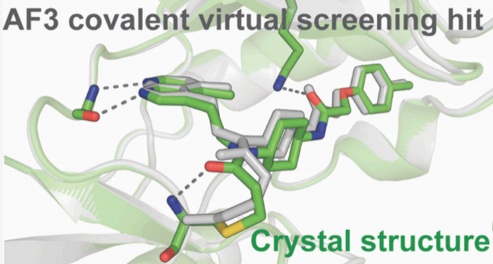 本文报道了一项里程碑式工作:将 Google DeepMind 的全原子结构预测模型 AlphaFold3(AF3) 首次系统性地应用于共价配体的虚拟筛选(covalent virtual screening),并在前瞻性筛选实验中成功发现了结构全新的 BTK 共价抑制剂。