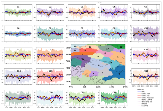 图1 去趋势的5年滑动平均的欧亚大陆SAT时间聚类结果及模式表现。基于1968–2001年观测/ERA5数据得到K-means时间聚类结果。C1–C20展示了第1至第20个聚类的区域平均SAT指数的时间序列,其中黑线表示1968–2021年的观测值,蓝线表示1968–2025年的多模式集合平均;橙色、红色和深红色线分别表示GRUBA在训练期(1972–2001)、测试期(2004–2021)和实时预测期(2022–2025)的预测结果。彩色虚线为四个DCPP模式(CESM1-1-CAM5、CMCC-CM2-SR5、MIROC6和NorCPM1)的预测值。阴影部分表示模式离散度。