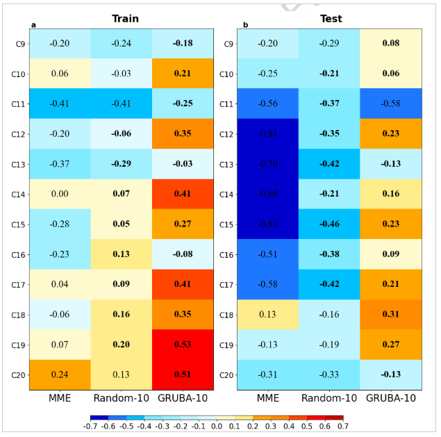 图3 GRUBA-10、Random-10和MME在第9至第20聚类上ACC技巧的热力图。GRUBA-10由SHAP方法在GRUBA中量化的特征贡献最强的10个DCPP成员组成。Random-10由随机10个初始场成员组成。图a和b分别对应训练时段(1972–2001)和测试时段(2004–2021)。加粗数字表示相较于MME具有更优的ACC技巧。