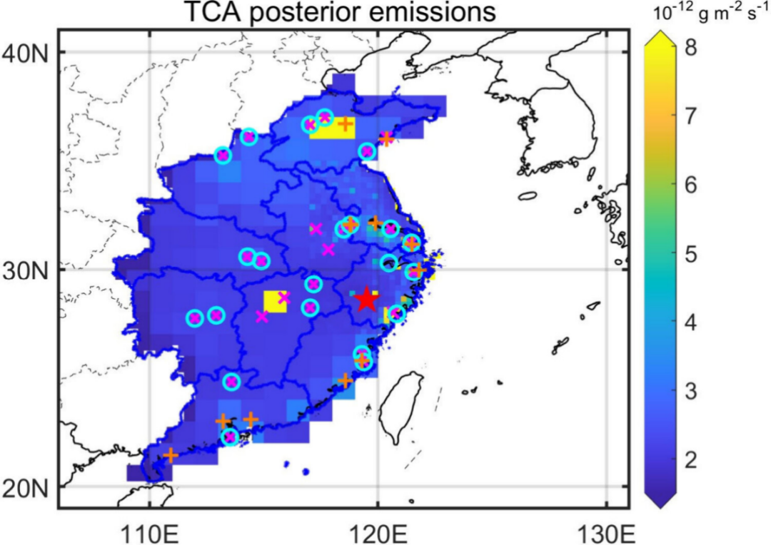 2. 基于上黄观测数据和反演算法定量了2023年8月-2024年7月中国东部地区TCA排放量,首次明确中国当前TCA排放处于“低水平稳定”状态。