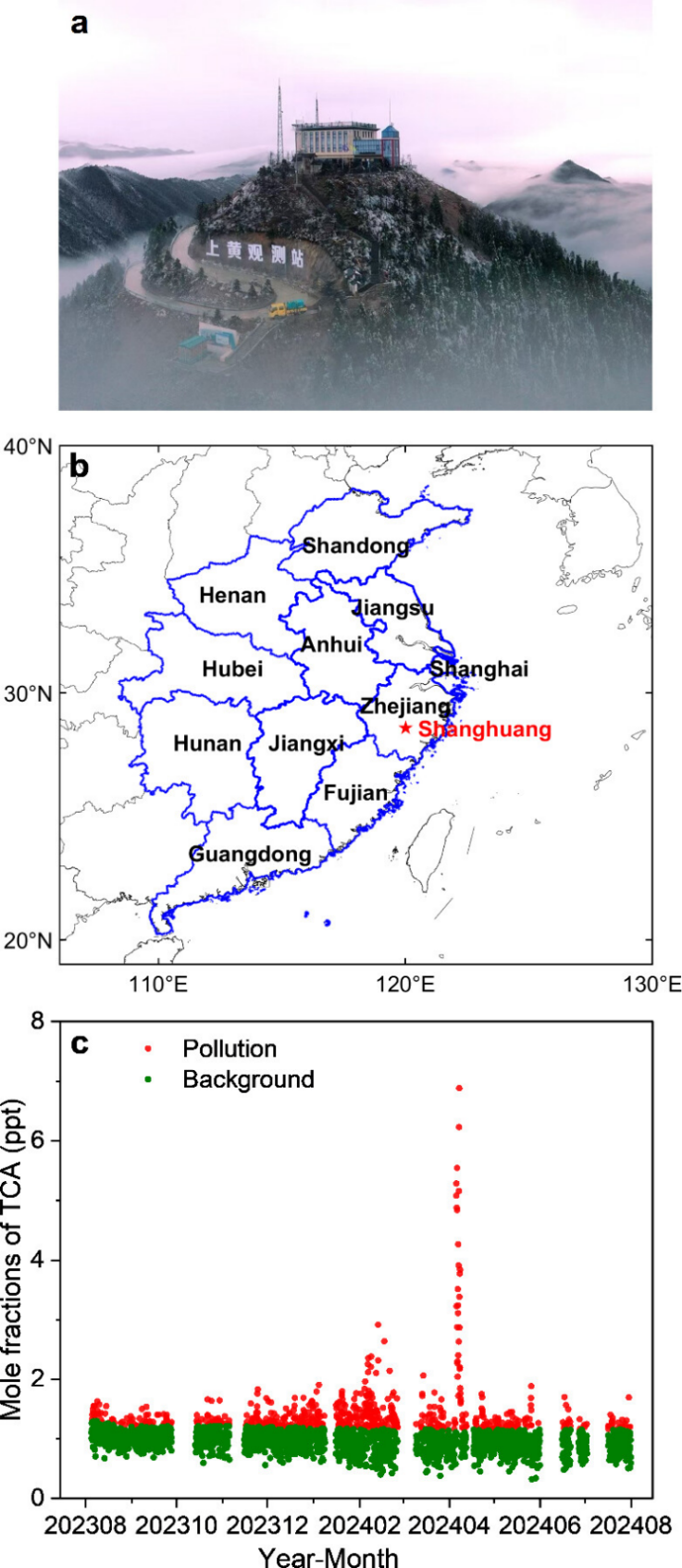图1 (a)上黄大气观测站外景、(b)本研究定义的中国东部区域和(c)上黄站观测到的TCA浓度,其中绿色散点为背景浓度,红色散点为污染浓度。