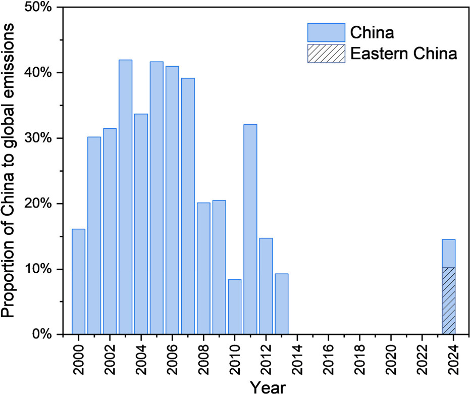 2000年中国TCA排放占全球的16.1%,2003年因非第5条国家(主要为发达国家)已启动管控而中国尚未管控,占比升至峰值41.9%;2003年后中国逐步落实管控措施,占比波动下降至2013年的9.3%。2023-2024年,华东地区TCA排放量占全球的10.2%,中国全国排放量占全球的14.5%;该占比回升并非中国排放增加,而是全球TCA排放量持续下降(从2000年的34.3 ± 32.5 Gg/yr降至2020年的2.3 ± 1.1 Gg/yr)所致。