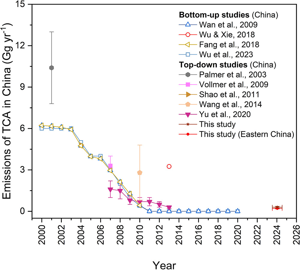 此前针对中国TCA排放的研究存在明显时间局限性:自下而上排放清单(基于活动数据与排放因子)仅覆盖至2010年,多假设2010年后中国无TCA排放;自上而下研究(基于大气浓度观测)虽能更真实反映实际排放,却仅估算到2013年(2013年排放量约0.3 ± 0.1 Gg/yr)。2013年后,中国TCA排放是否持续维持低水平、是否出现反弹,或是否存在未被识别的排放源,均缺乏观测数据支撑,形成长达近十年的“数据空白期”。现有研究不仅存在数据时间缺口,且自上而下的研究十分缺乏,导致排放分布情况未知。