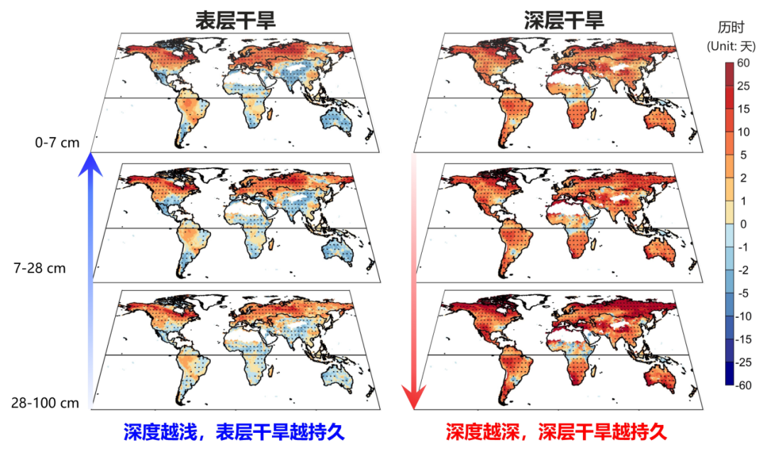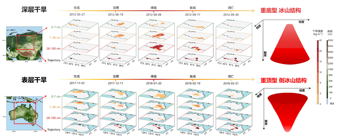基于站点观测、ERA5-Land等再分析数据及CMIP6多模式地球系统模式模拟,团队首次在全球尺度上识别并追踪了具有垂向结构的四维土壤干旱事件。根据垂向结构特征,将土壤干旱划分为深层主导、重底型的深层干旱和表层主导、重顶型的表层干旱(图1)。深层干旱表现为深层(28–100 cm)土壤水分亏缺比表层(0–28 cm)土壤水分亏缺面积更广、历时更久的垂向特征。这类如“冰山”般隐藏在地下的深层干旱,难以被主要依赖表层土壤水分信息的大尺度卫星遥感手段充分捕获,其相较于表层干旱整体历时更久、强度更大,主要分布在南美洲、非洲及南亚等地区。