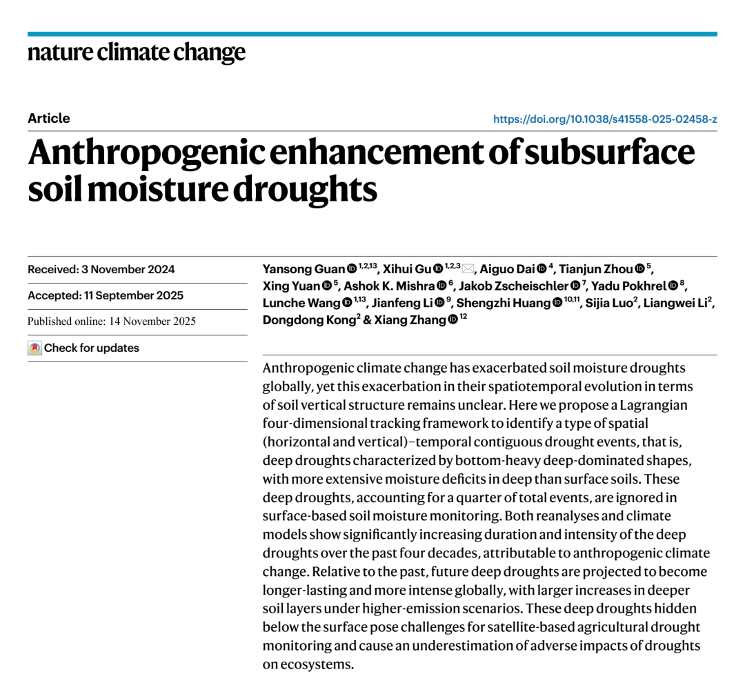 2025年11月14日,中国地质大学(武汉)地理与信息工程学院顾西辉教授团队联合中国科学院大气物理研究所、纽约州立大学、得克萨斯农工大学、亥姆霍兹环境研究中心、密歇根州立大学等国内外机构,在Nature Climate Change发表题为“Anthropogenic enhancement of subsurface soil moisture droughts”的最新研究成果。