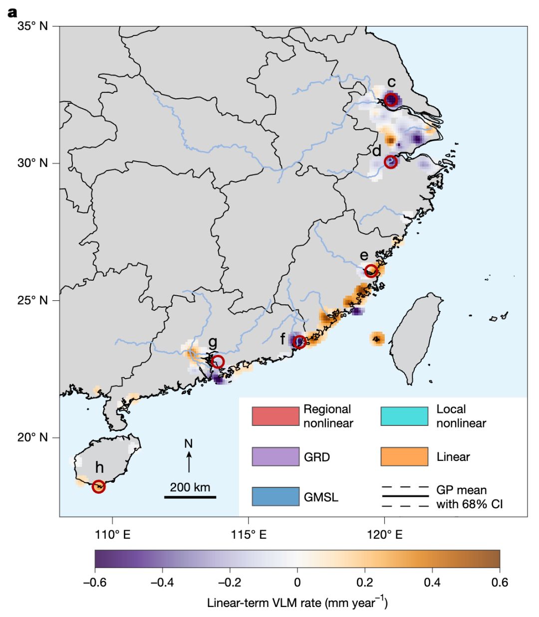 全球海平面上升与区域地面沉降形成复合威胁:在全球平均海平面以创纪录速度上升的同时,中国东南部主要城市正在经历快速沉降。在研究的20个沿海大城市中,2015-2022年期间的实测沉降有至少94%源于人类活动——主要是地下水过度开采和大规模城市建设,自然过程的贡献微乎其微。在每个被研究的城市中都存在一些区域的沉降速度要快于全球海平面上升速度。这意味着中国东南沿海城市不仅要承受气候变化导致的全球海平面上升威胁,同时还面临地表快速下沉的双重压力,使得这些城市的相对海平面上升速度远超全球平均水平。