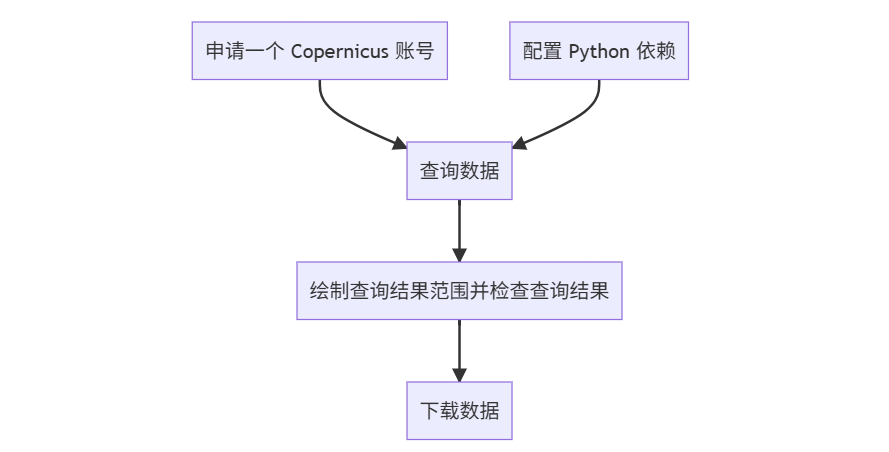 本文主要介绍通过 Python 从哥白尼数据空间生态系统(https://dataspace.copernicus.eu/) 下载哨兵1(Sentinel-1)号 VV&VH 极化 IW_SLC__1S 产品数据。整体流程如下: