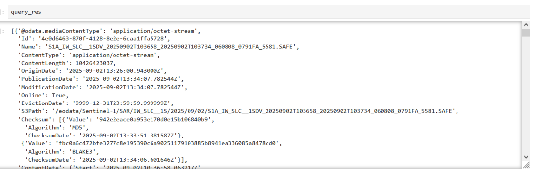 query_res 为一个列表,包含每一景查询到的数据信息,每一景信息为一个字典,结果如下: