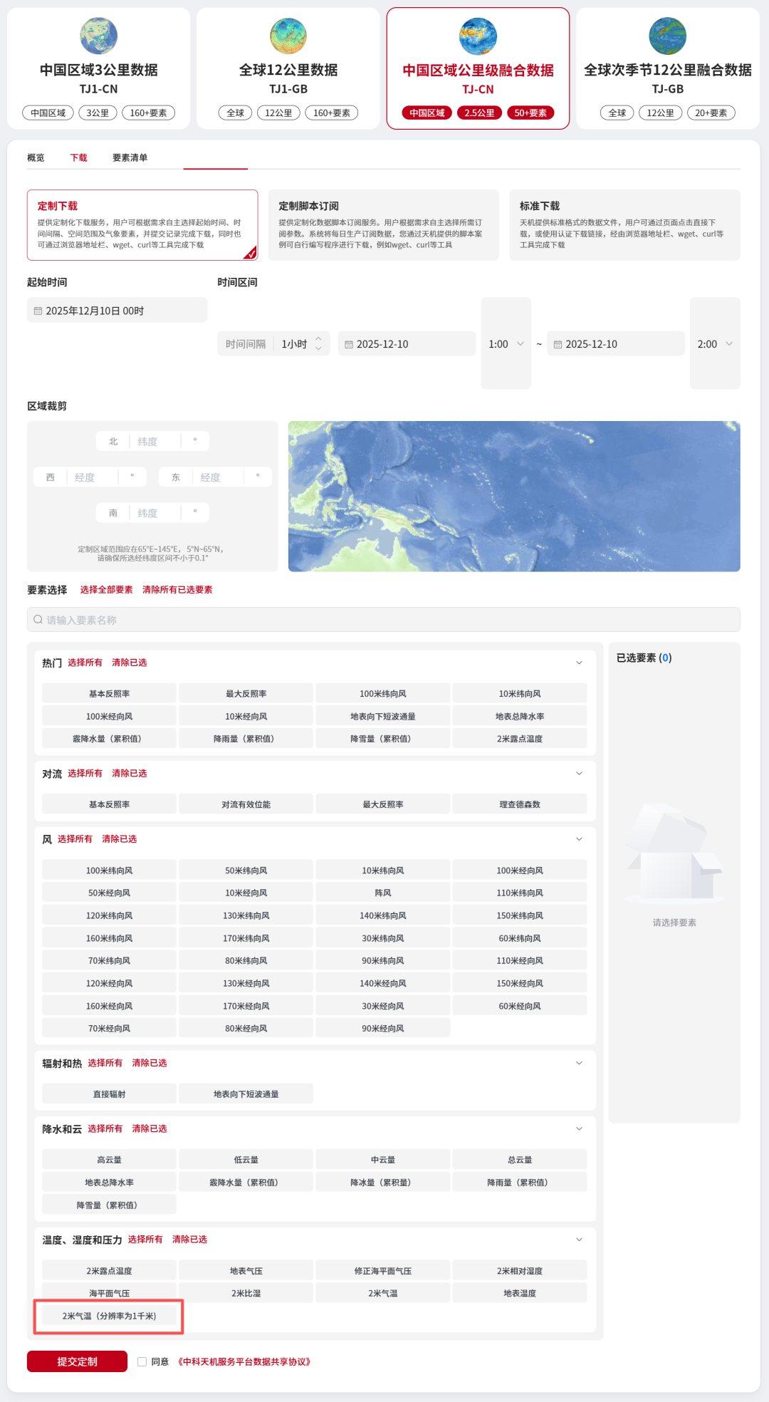 中科天机数据下载页面要素齐全,下载方式灵活多样,操作界面便捷直观!其高性能服务器支持单个订单数据量大小上限提升至4GB。还可支持硬盘邮寄定制数据服务。其中,2m气温的水平分辨率更是达到了1km。