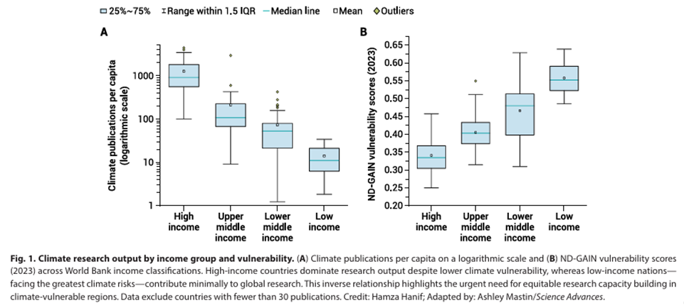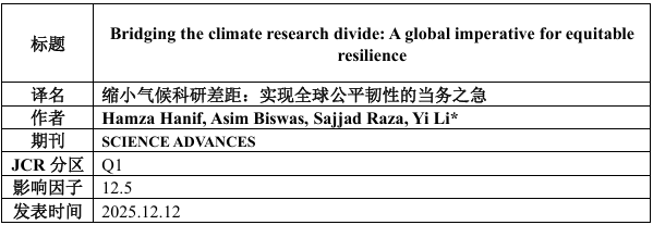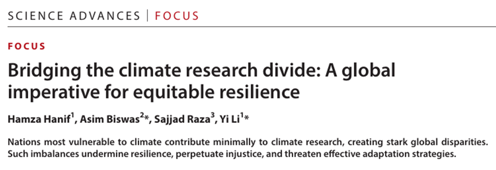 Hanif, H., Biswas, A., Raza, S., Li, Y., 2025. Bridging the climate research divide: A global imperative for equitable resilience. Science Advances, 11(50): eadz0469