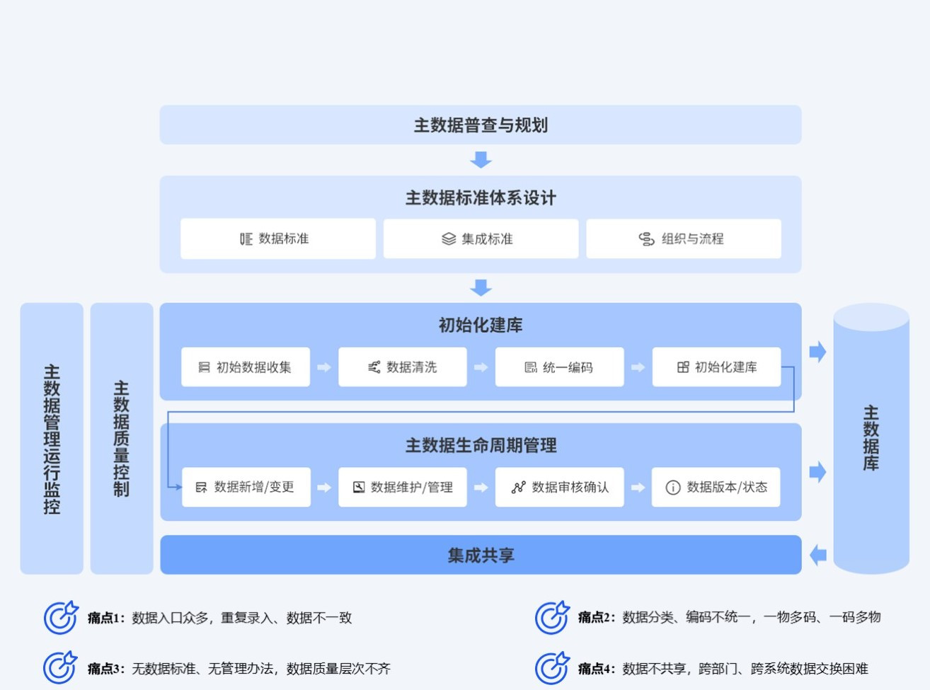 很多人以为主数据管理就是做一次数据清洗,做完就结束了,其实不然。主数据管理管的是一个完整的数据生命周期,从数据的创建,到维护,到分发,到归档,每一个环节都在管理范围之内。