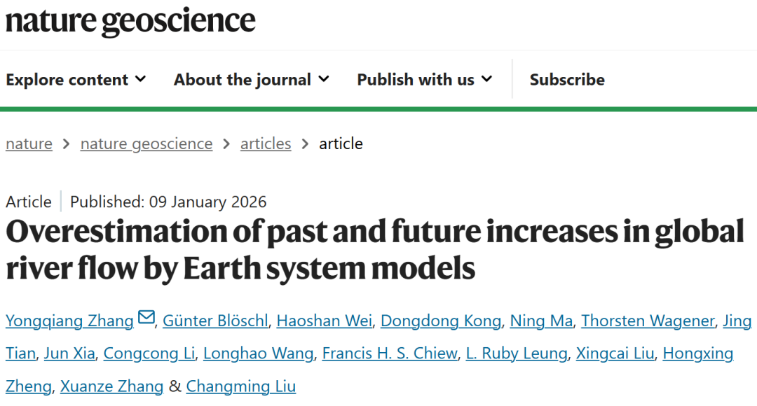 北京时间2026年1月9日,该成果以“Overestimation of past and future increases in global river flow by Earth system models”为题在线发表于《自然—地球科学》(Nature Geoscience)。中国科学院地理科学与资源研究所张永强研究员为论文第一作者和唯一通讯作者。