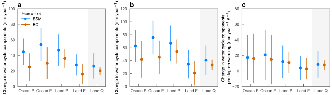 图2 气候变化下全球水循环分量的变化。 对比地球系统模型(ESMs,蓝色)与涌现约束(EC,橙色)方法的预估结果。a,SSP2-4.5情景下历史时期(1980–2014年)与未来时期(2051–2100年)间的变化。b,同a,但为SSP5-8.5情景。c,每升温1℃的水循环分量变化。量化竖线表示不确定性。