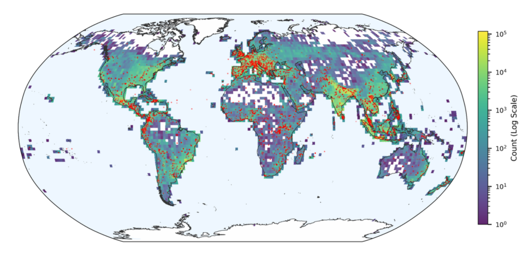 (全球地图:显示了 Groundsource 中洪水事件的密度。红点表示来自 GDACS 的洪水。)