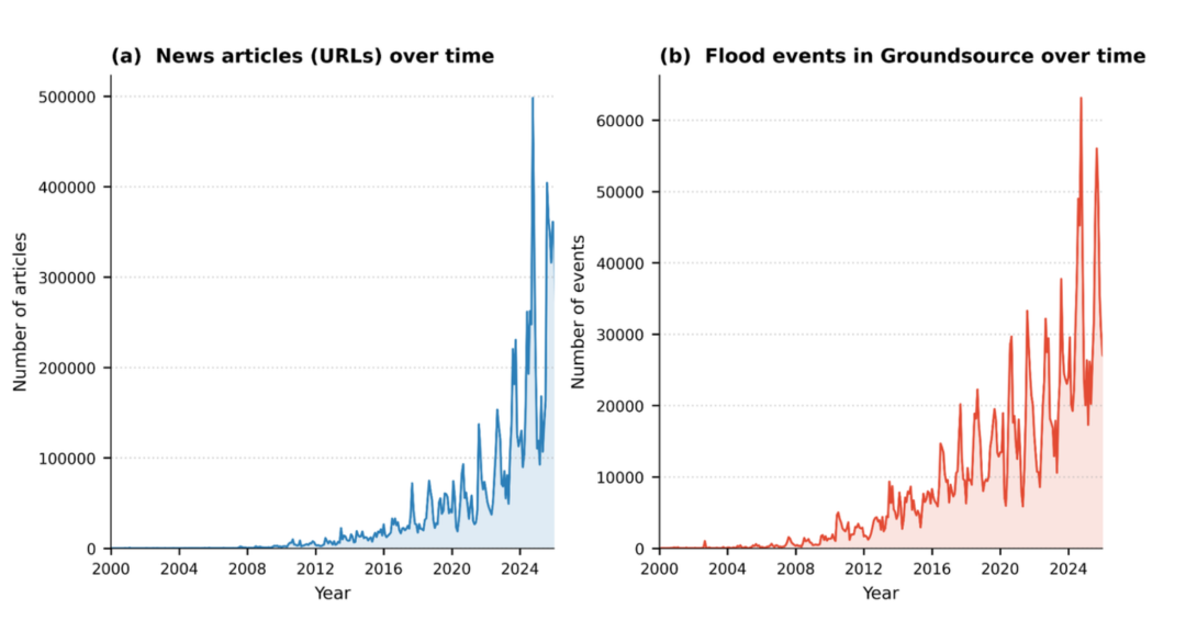 (图表:展示了数字化新闻的指数级增长以及 Groundsource 流程捕捉到的洪水事件的相应增加,突显了近年(2020-2025 年)数据密度的显著提升。)