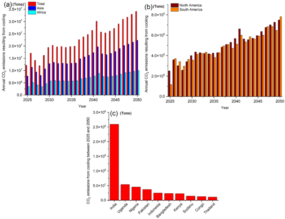 结果显示全球低收入群体因制冷耗电产生的CO₂排放量从2025年的1218万吨增至2050年的3411万吨。2025年至2050年全球累计CO₂排放总量达到6.007亿吨。2025-2050年累计CO₂排放总量前十名的国家,印度以2.59亿吨位居首位,显著高于其他国家。各洲排放量最大的国家分别为:亚洲的印度、非洲的乌干达、北美洲的美国、南美洲的哥伦比亚以及欧洲的法国。印度的一些城市和邦已经实施了高温行动计划,以减轻极端高温对居民健康的影响。这些措施包括建立预警系统,通过短信向居民发送高温警报,建议他们采取防护措施;并在城市地区设立"降温中心",例如公共建筑、购物中心、寺庙和公园,供居民在高温期间躲避。此外,还提供高温期间保持健康的指导,包括建议多喝水和避免户外活动。然而,这些措施并未为低收入群体提供公平的制冷获取途径。亚洲、非洲、南美洲和欧洲内部的分布极不均匀。排放量最高的国家可能比同大洲其他国家的CO₂排放量高出数倍甚至十倍以上。2025年低收入群体空调制冷耗电量是其住宅屋顶潜在光伏发电量的很多倍以上。这表明,即使现有低收入群体住宅的所有屋顶都安装光伏设备,也远远无法满足制冷需求。发展中国家政府需要将低收入群体的空调制冷耗电量提前纳入其可再生能源发电规划。否则,为降低该群体的湿热风险,他们将不得不持续增加煤炭等化石燃料的发电量,这将导致额外的CO₂排放。湿热风险主要集中在发展中国家的低收入群体,全球范围内制冷服务的获取存在显著不平等。各国政府需要关注这些低收入群体,并提供更大的财政和政策支持。对于印度而言尤其如此,为实现这一目标,其可能需要排放更多的CO₂,并可能推迟其宣布的2070年实现碳中和的目标。鉴于经济差异,发达国家应提供更多财政援助,并设立气候融资基金,以帮助发展中国家进行低碳转型。