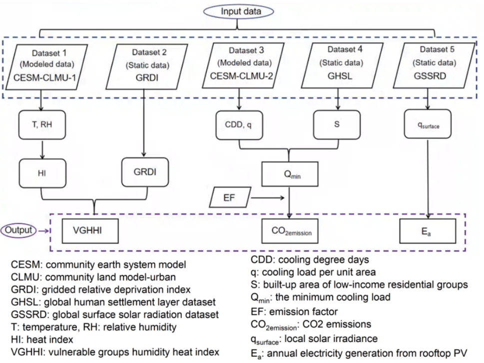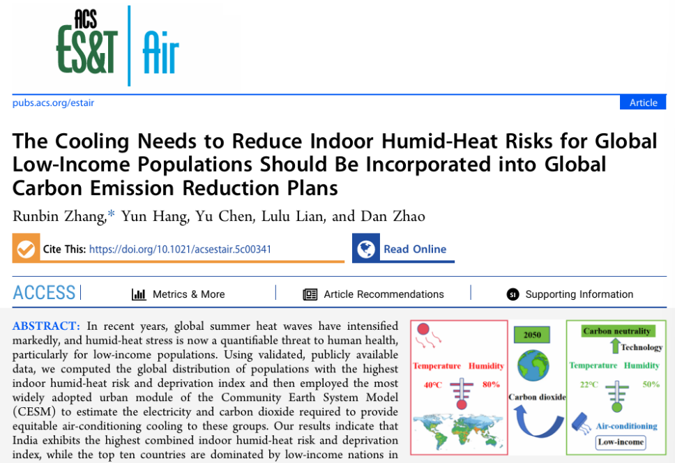 近日,兰州大学资源环境学院张润斌团队在美国化学学会知名期刊ACS ES&T air发表全球未来湿热风险及相关碳排放的文章。该文章利用经过验证且公开可用的数据,计算了全球室内湿热风险和贫困指数最高的人群分布,然后采用最先进的社区地球系统模型(CESM)的城市模块,估算为这些群体提供公平的空调制冷所需的电力和二氧化碳排放量。