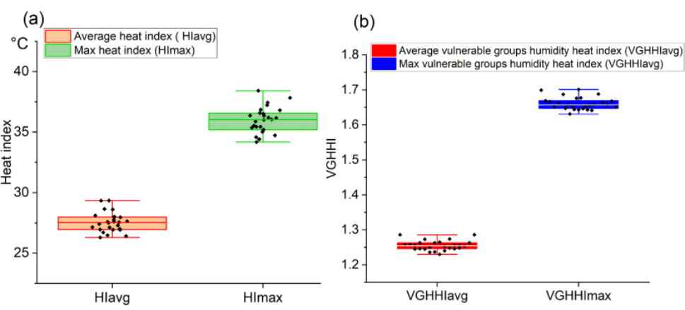 图3 印度未来湿热指数和脆弱人群湿热指数的平均值和最大值