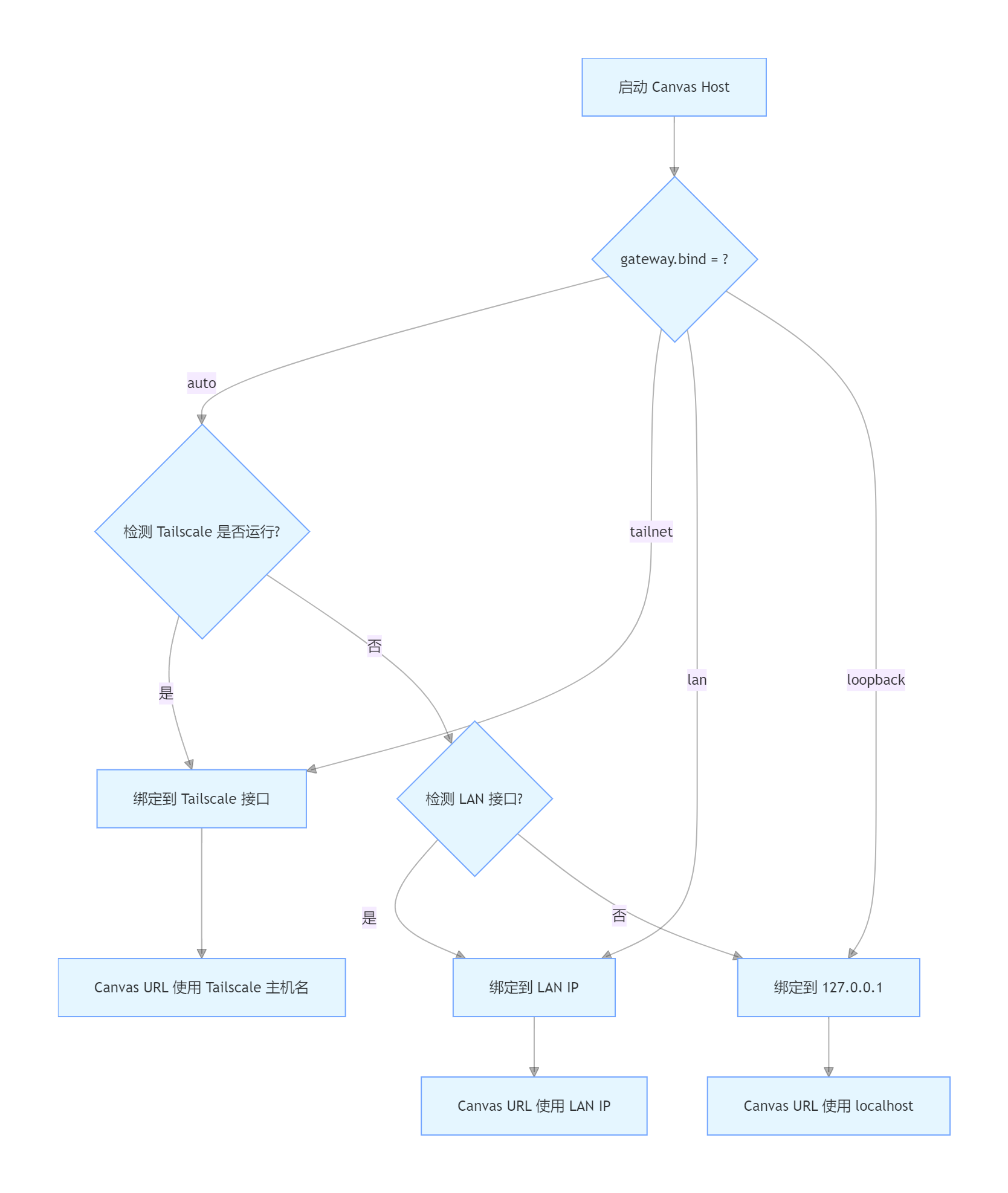Canvas Host 的网络绑定行为由 gateway.bind 配置项控制,系统会按优先级选择最合适的接口: