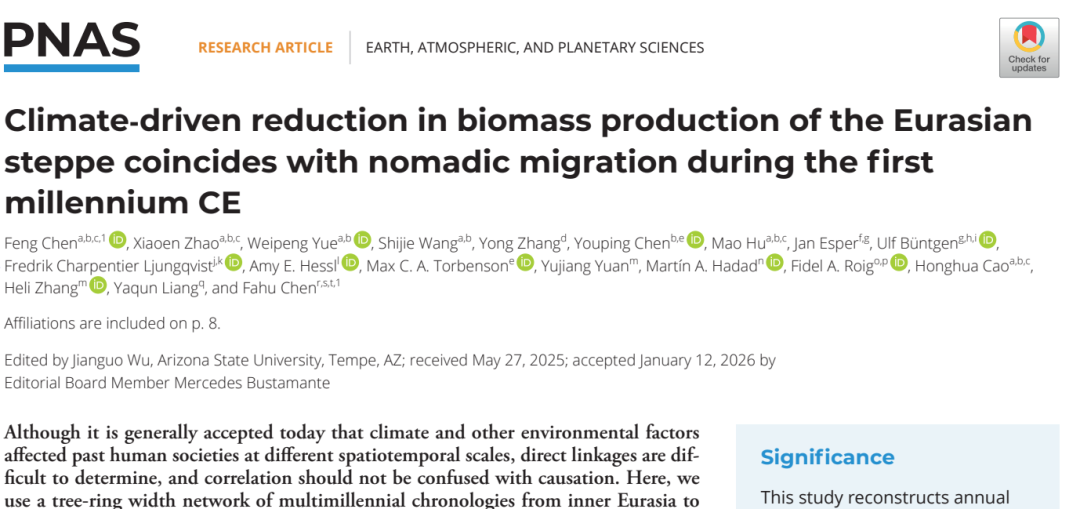 北京时间2026年2月9日,云南大学科研团队在国际顶级综合性学术期刊Proceedings of the National Academy of Sciences(PNAS)发表研究论文,题为“Climate-driven reduction in biomass production of the Eurasian steppe coincides with nomadic migration during the first millennium CE”。该研究以高时间分辨率的树轮资料为核心证据,重建欧亚草原植被净初级生产力(Net Primary Productivity, NPP)长期变化,为理解气候—生态—游牧民族社会变迁耦合机制提供新的量化依据。