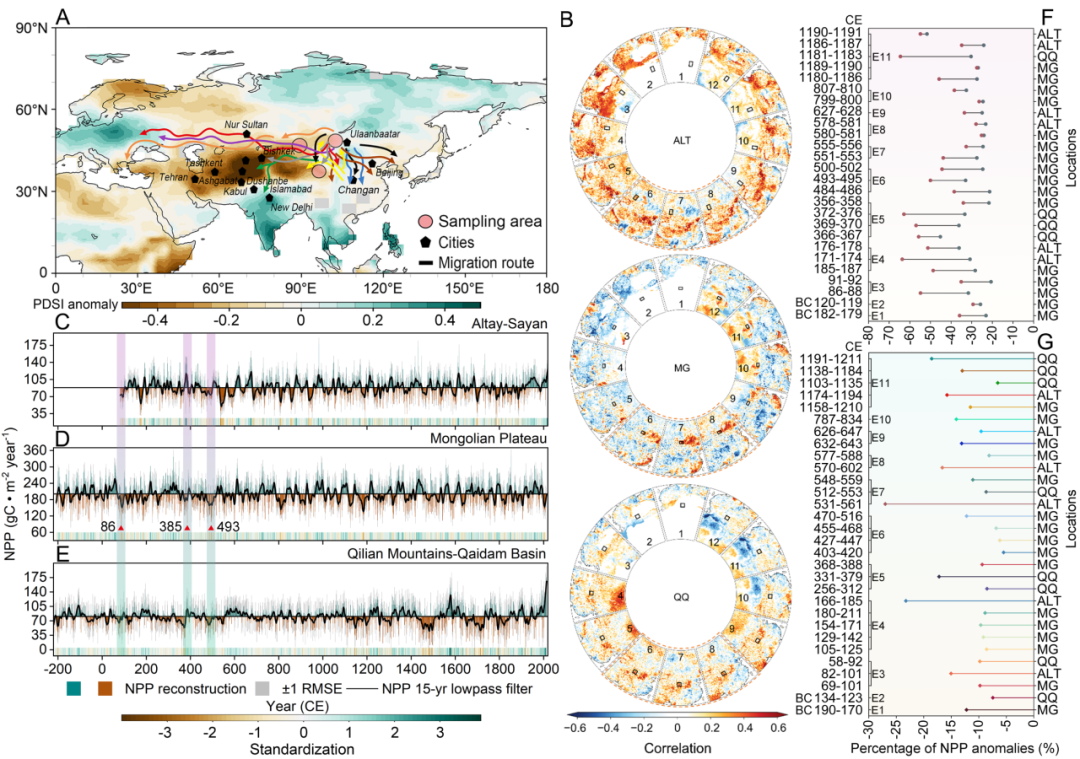 欧亚草原是全球最典型、最广袤的干旱—半干旱草原带之一,亦是历史上游牧文明长期繁衍、交流与融合的重要舞台。与传统农耕文明依山傍水以耕地为主不同,游牧民族的物质需求高度集中于草地生态系统的供给能力,即饲草产量主要取决于草地生产力,进而决定牲畜生产和部落生计韧性。植被净初级生产力作为植被通过光合作用固定的净碳量,是衡量生态系统能量与物质输入的核心指标,能够直接表征草地能够“生产多少生物量”。当区域气候出现持续性转冷或转干,尤其当极端气候强烈影响高海拔夏季牧场时,可能扰动草原系统的稳定性,从而触发人口迁徙、边境冲突、贸易与部落重组等一系列社会响应。高时间分辨率的古气候证据相对匮乏,使得“环境变化—资源压力—游牧民族迁徙”的证据链条长期缺少可被年尺度数据检验的关键环节。此外,当前欧亚草原正在经历显著的全球变暖与极端天气事件影响,未来升温幅度可能明显高于全球平均水平,这使得从长期视角识别草原生态系统变化的临界点和草原社会脆弱性尤为重要,不仅具有基础研究价值,同时对现代草地资源管理与加强社会韧性具有指导意义。