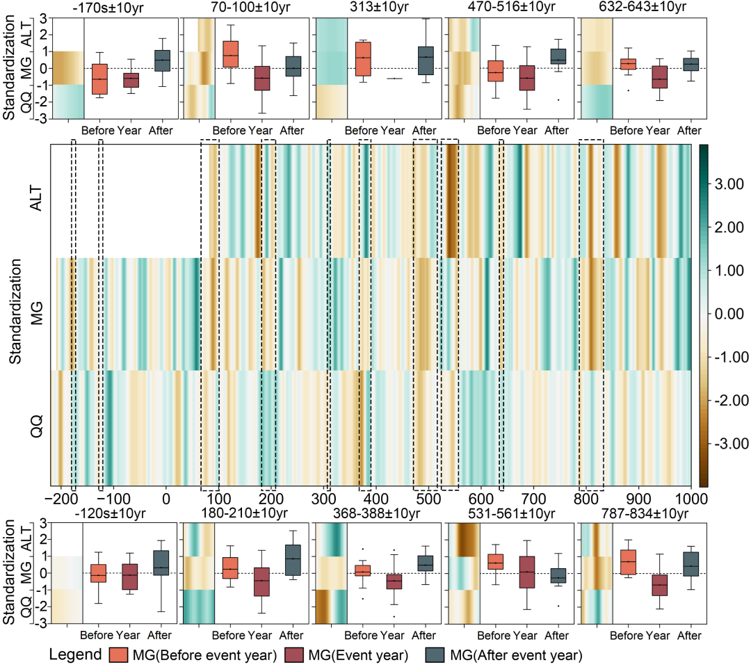 图2 自公元前200年以来的15年低通滤波植被净初级生产力变化热图。箱线图和虚线展示了170s BCE,120s BCE,70–100 CE,180–210 CE,313 CE,368–388 CE,470–516 CE,531–561 CE,632–643 CE和787–834 CE的植被净初级生产力变化。