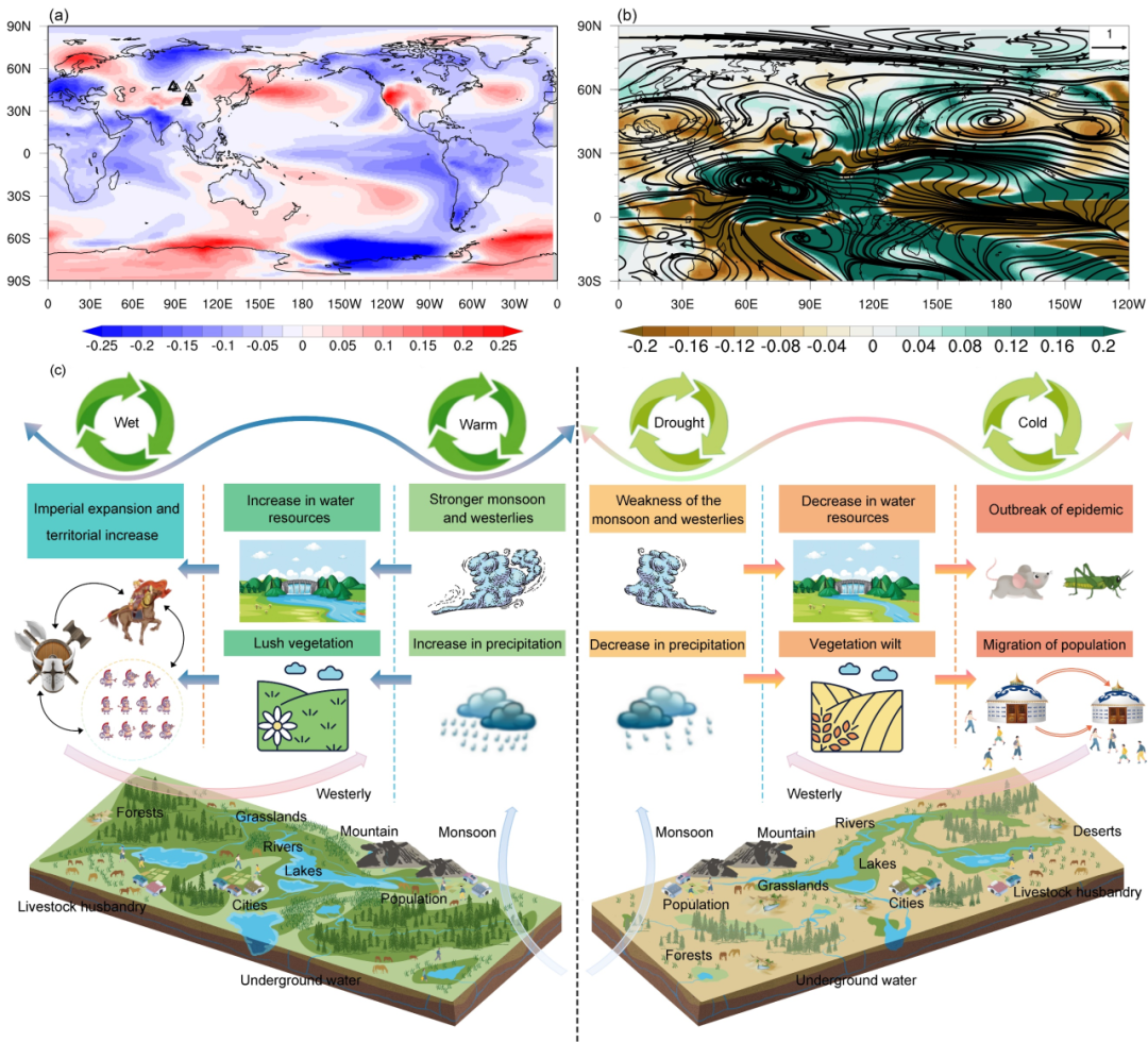 本研究不仅推动了“气候—生态—社会”耦合研究从相关性走向机制化与可检验化,也在实践层面为干旱—半干旱区生态安全与草地可持续治理提供了历史尺度的参照系。在当代气候变暖与极端事件增强的背景下,欧亚草原未来可能面临更频繁、更持久的生产力波动与生态风险。未来,研究团队将进一步推动多学科深度融合,结合考古与历史文献证据、人口与迁徙路线数据、以及地球系统模式模拟,构建从气候异常到生态冲击再到社会响应的完整证据链与可验证模型,为区域可持续发展与社会韧性提升提供更具前瞻性的科学支撑。