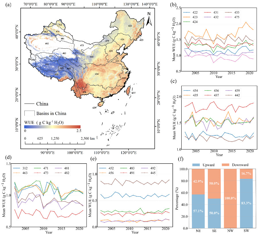 图1. (a) 中国内陆流域水分利用效率20年平均值空间分布图,(b)东北地区、(c)东南地区、(d)西北地区和(e)西南地区各流域WUE年平均值,以及(f)区域流域尺度WUE变化趋势特征