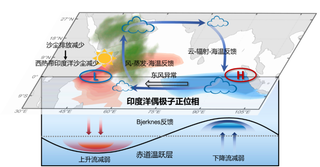 为验证上述观测关联,研究团队利用气候模式开展了沙尘排放的敏感性数值试验。模拟结果一致表明,中东沙尘减弱会引发印度洋西部海表温度上升,并激发赤道东风异常,导致东部温跃层变浅。这些异常信号通过Bjerknes正反馈及风–蒸发–海温反馈机制进一步放大,最终促进IOD正位相事件的发展(图2);反之,沙尘增强则会促进IOD负位相事件的发展。该研究清晰揭示了“沙尘–海温–风场–气候反馈”的跨区域遥相关物理链条。