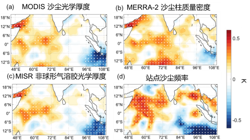本研究基于长期观测数据的分析发现,即使剔除ENSO信号的影响,沙尘活动的减弱仍与IOD的正位相表现出显著相关性,回归系数可达约0.5 K(图1)。进一步量化分析表明,中东地区的沙尘活动可解释IOD约36%的年际变率方差。尤其在秋季,其影响力已超过ENSO,成为该季节IOD最主要的驱动因子。