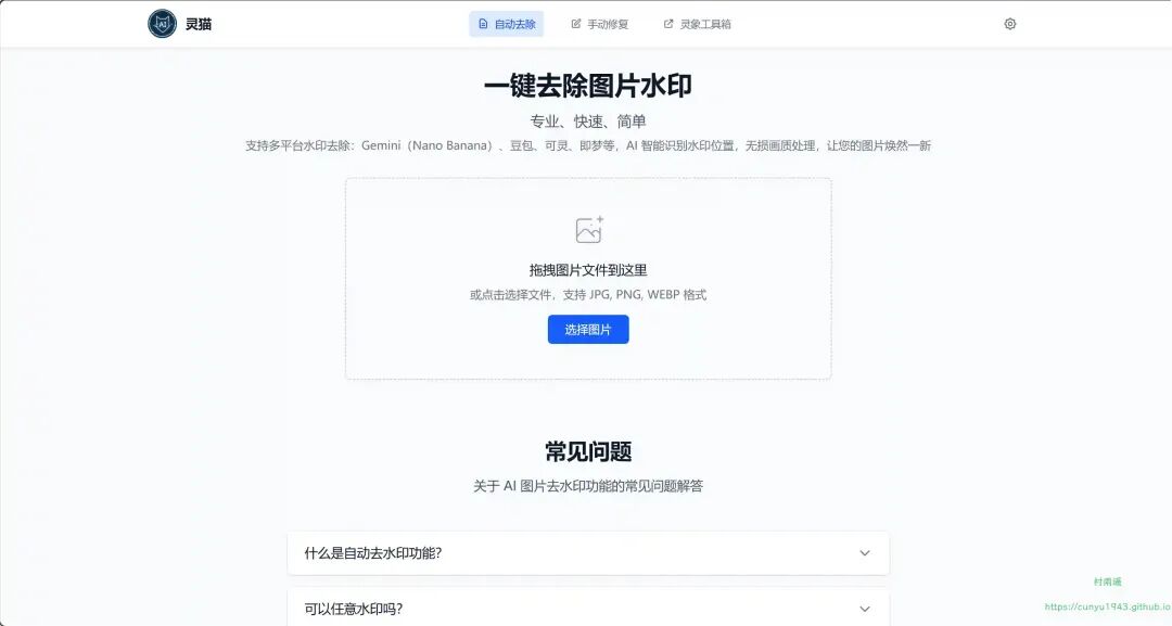 一键去除图片水印,支持多平台水印去除:Gemini(Nano Banana)、豆包、可灵、即梦等,AI 智能识别水印位置,无损画质处理,让您的图片焕然一新。