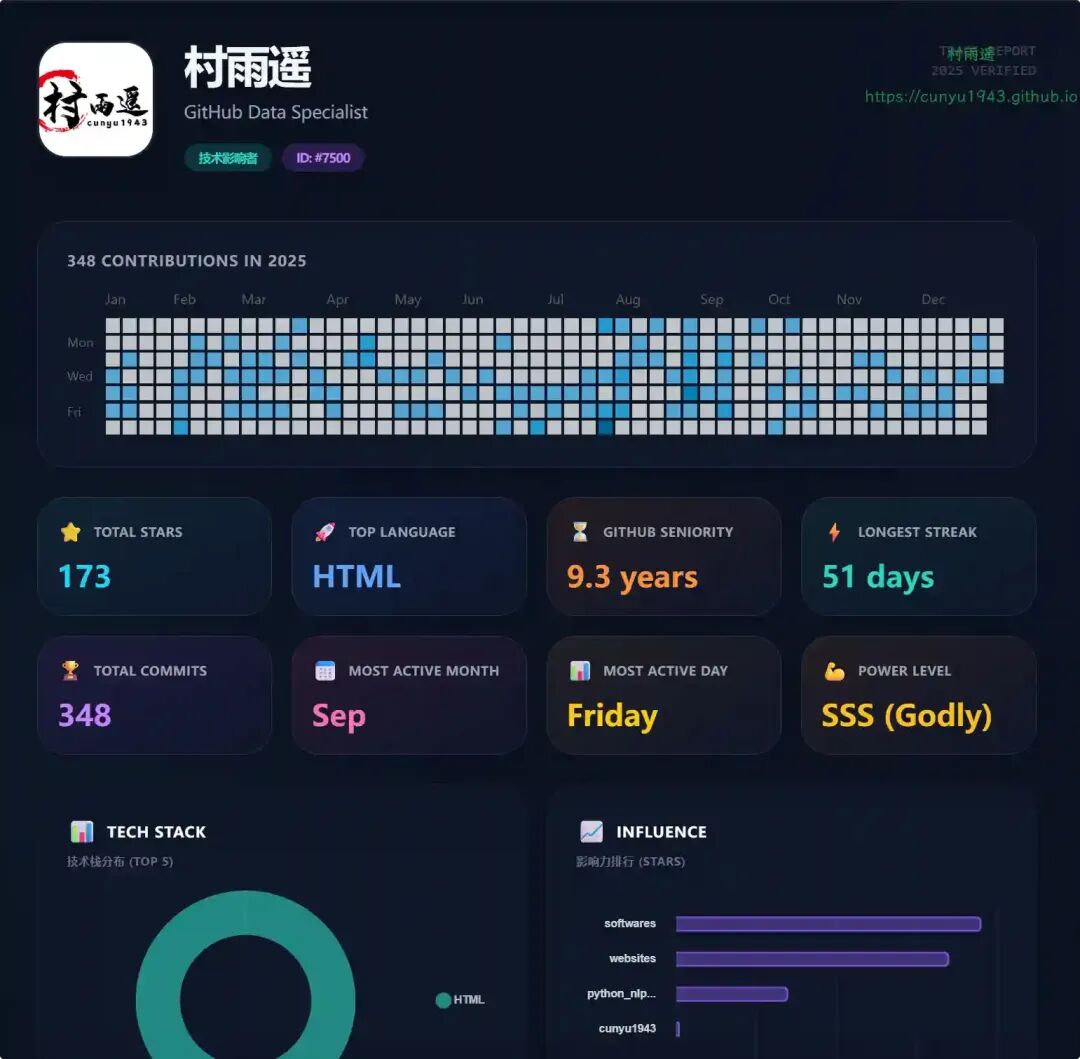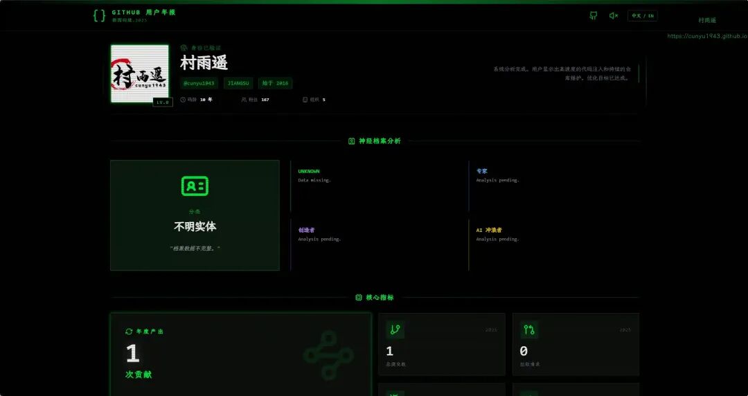 与标准报告不同,该系统利用 AI 对你的代码风格进行心理分析,根据你的语言使用、提交习惯和项目主题,为你分配独特的人格画像(如 “赛博架构师”、“重构大师”)。