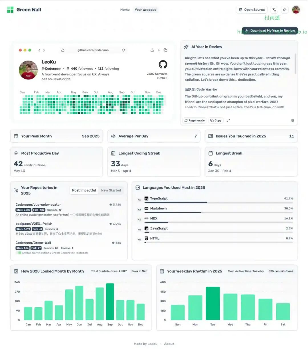 一个强大的 Web 工具,帮你更轻松地回顾自己在 GitHub 上多年来的贡献记录。它可以把你的贡献数据生成精美的图片,还能提供 AI 驱动的年度报告,方便保存与分享。