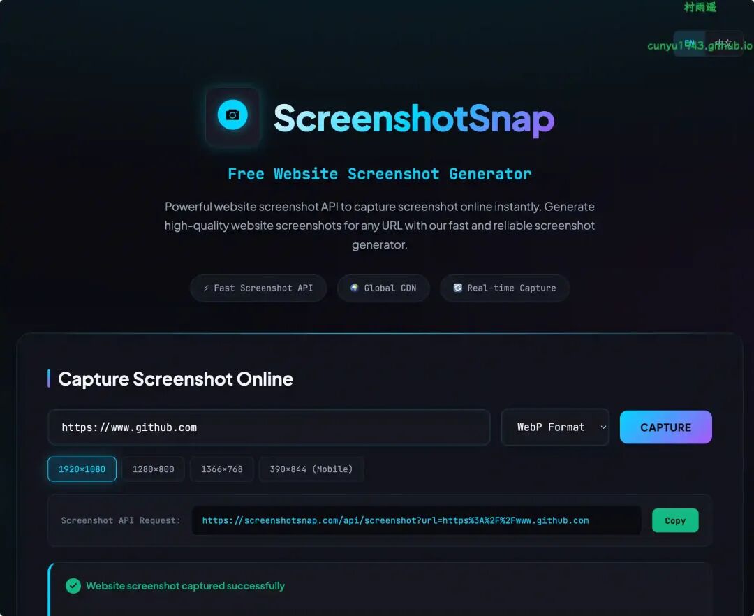 免费的网站截图 API 服务。使用我们的 website screenshot generator 在线捕获任何网页截图。支持 WebP / PNG 格式,全球 CDN 加速,毫秒级响应。