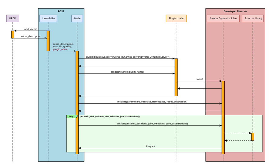图2. 时序图:用户可通过launch文件指定参数plugin_name,使用pluginlib实例化IDS库;具体求解器会调用外部库以获取动力学组件。