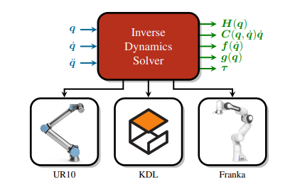 本文提出了一种基于 ROS 2 的、机器人无关的逆动力学求解库。在给定关节位置、速度和加速度的情况下,该软件能够计算机械臂各关节所受的力矩,同时提供影响系统运动方程(EOM)的各类动力学分量。发布并完整文档化了该代码库,其中包括: