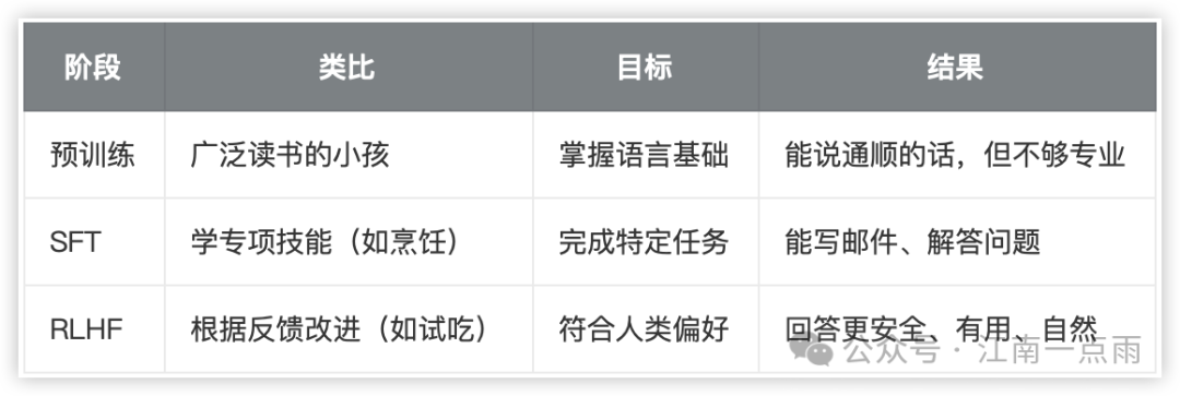 通过这三个阶段,大模型从“书呆子”成长为“专业助手”,既能理解需求,又能用人类喜欢的方式回应。