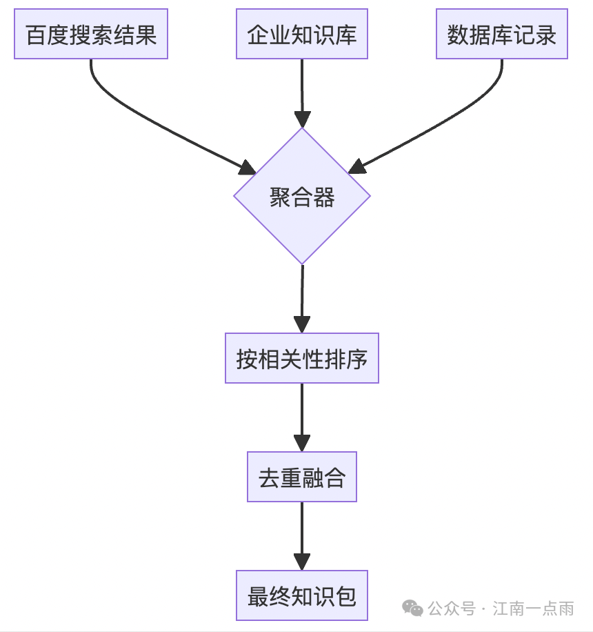 Content Aggregator 就像物流中心的智能调度员,负责把不同渠道搜到的知识包裹(Content)合并成一个最优清单。比如同时用百度搜索、企业知识库、数据库查询三种方式找答案,聚合器会综合所有结果,帮你整理出最相关的信息包。