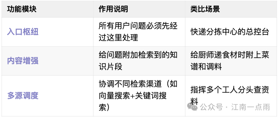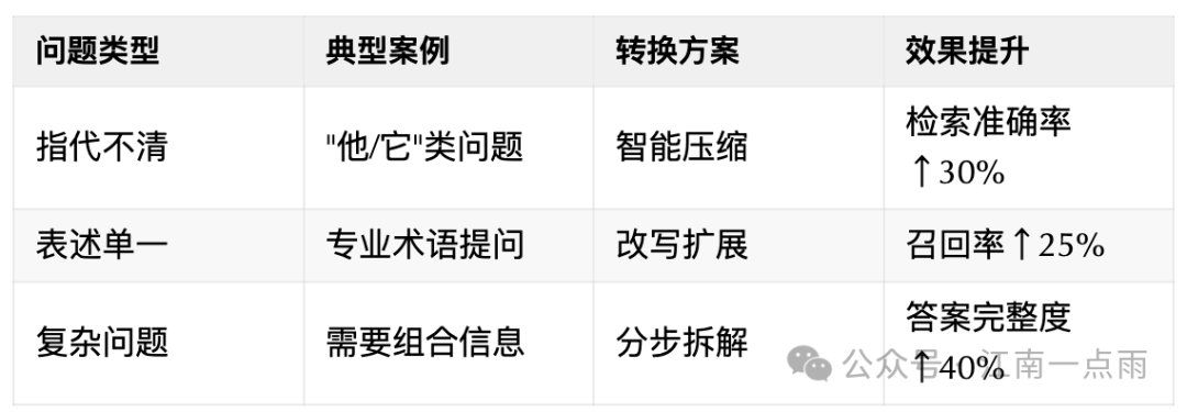 这个模块就像问题的"翻译官",负责把原始问题加工得更适合检索。常见加工方式有: