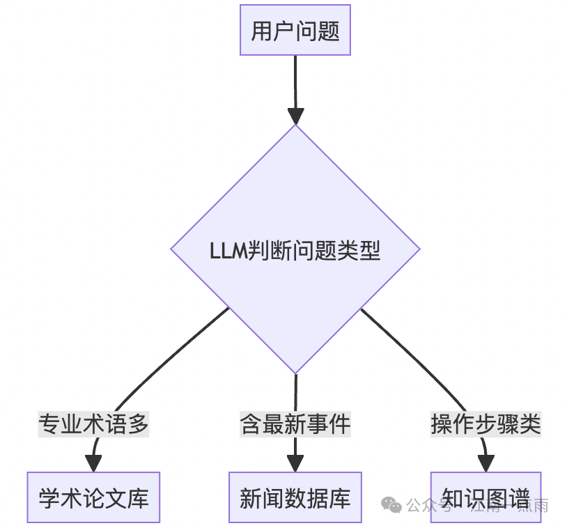核心原理: • 用大模型(LLM)当"决策大脑",根据问题内容智能选择检索路径 • 类似人类专家快速判断"这个问题该查哪类资料"